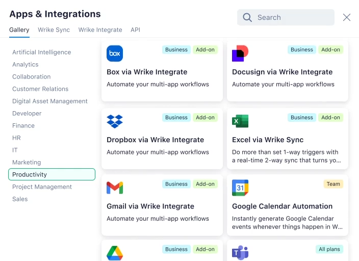 Yhdistä Wrike CRM:ääsi, ERP:hen ja kaikkiin muihin kriittisiin järjestelmiin. Yksi totuuden lähde kaikelle projektidatalle ilman manuaalista tiedonsiirtoa. Oganisaation data synkronoituu automaattisesti ja päätökset perustuvat ajantasaiseen kokonaiskuvaan.
