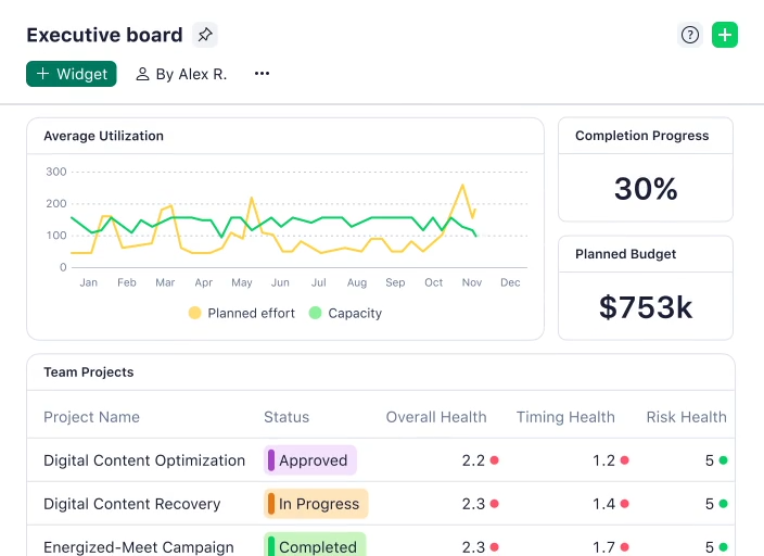 Unohda manuaalinen resurssipalapeli eri tiimien välillä. Wrike optimoi kuormituksen automaattisesti koko organisaatiossa ja löytää pullonkaulat ennen kuin ne hidastavat projekteja. Kun kilpailijasi vielä tekevät Excel-taulukoita resursseista, sinä sijoitat oikeat ihmiset oikeisiin projekteihin algoritmisesti.
